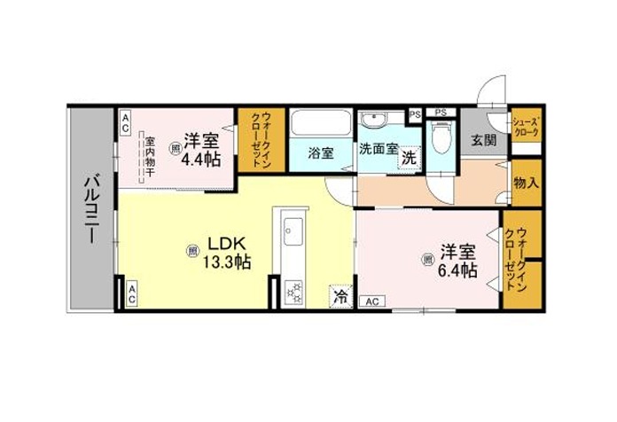 | 間取り詳細 | LDK 13.3畳 、 洋室 6.4畳 、 洋室 4.4畳 |