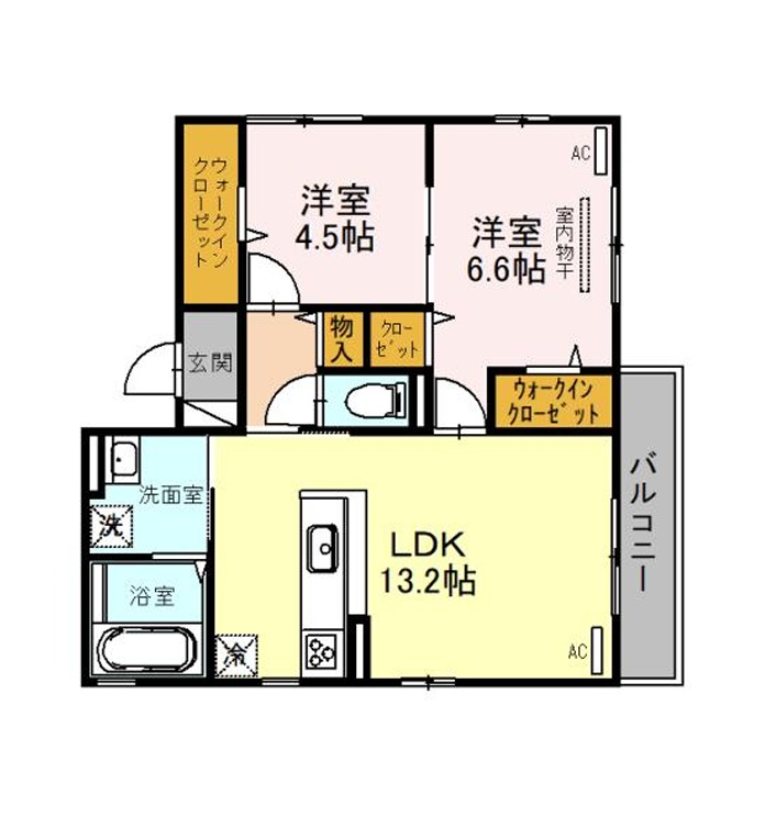 | 間取り詳細 | LDK 13.2畳 、 洋室 6.6畳 、 洋室 4.5畳 |