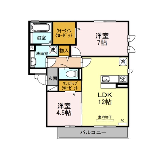 | 間取り詳細 | LDK 12畳 、 洋室 7畳 、 洋室 4.5畳 |