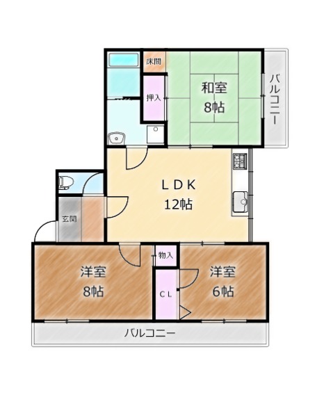 | 間取り詳細 | LDK 12畳 、 洋室 8畳 、 洋室 8畳 、 和室 8畳 |