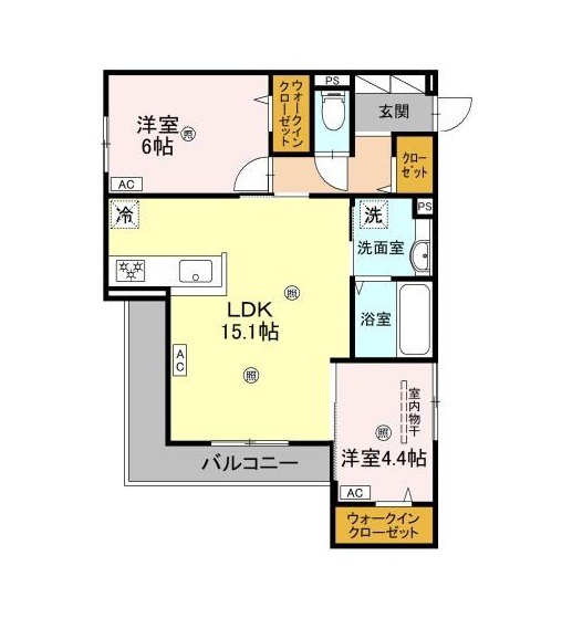 | 間取り詳細 | LDK 15.1畳 、 洋室 6畳 、 洋室 4.4畳 |