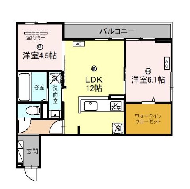 | 間取り詳細 | LDK 12.4畳 、 洋室 6.1畳 、 洋室 4.5畳 |
