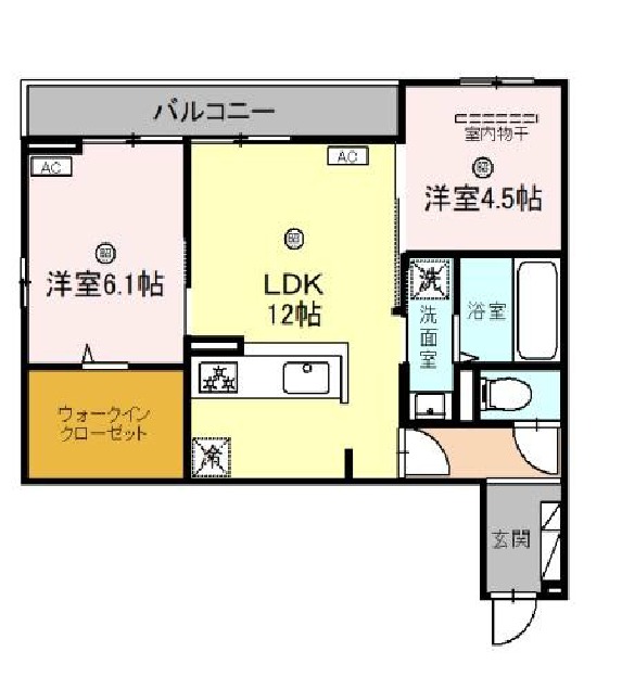 | 間取り詳細 | LDK 12.4畳 、 洋室 6.1畳 、 洋室 4.5畳 |