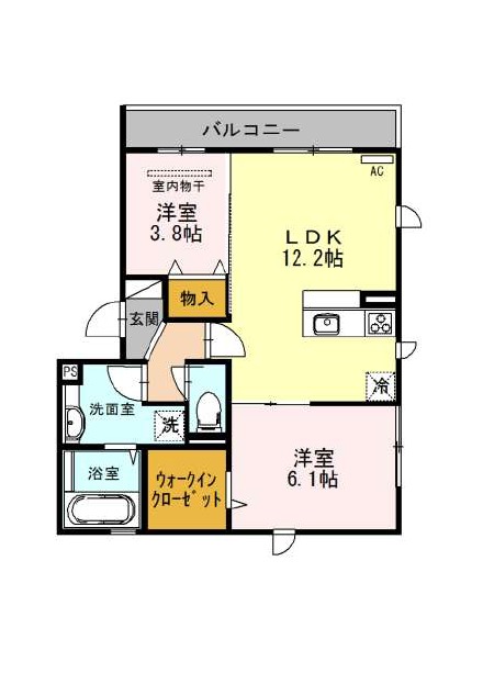 | 間取り詳細 | LDK 12.2畳 、 洋室 6.1畳 、 洋室 3.8畳 |