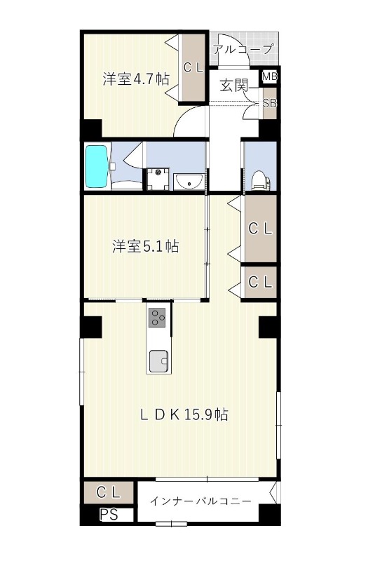 | 間取り詳細 | LDK 15.9畳 、 洋室 5.1畳 、 洋室 4.7畳 |
