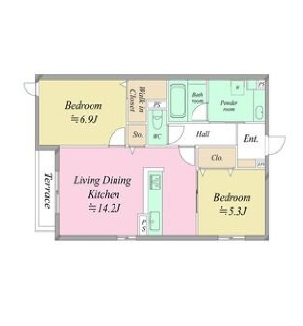 | 間取り詳細 | LDK 14.2畳 、 洋室 6.9畳 、 洋室 5.3畳 |