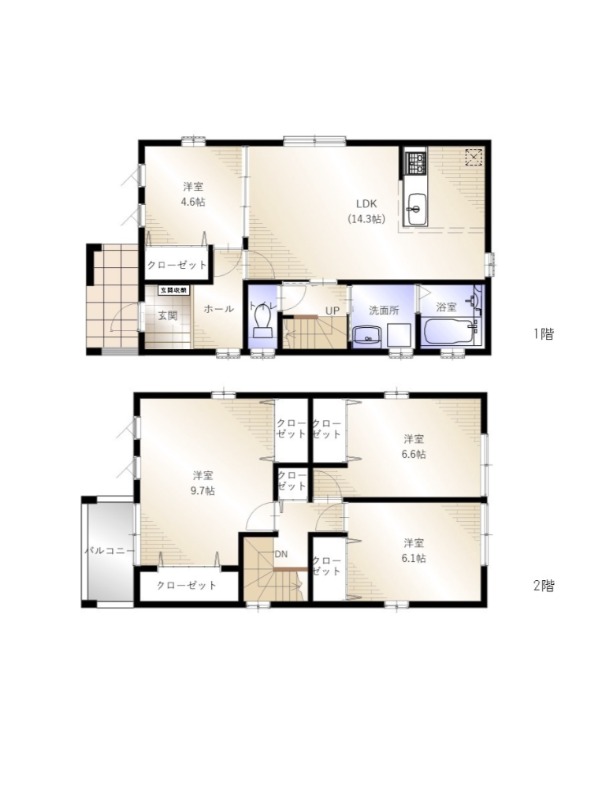 | 間取り詳細 | LDK 14.3畳 、 洋室 9.7畳 、 洋室 6.6畳 、 洋室 6.1畳 、 洋室 4.6畳 |