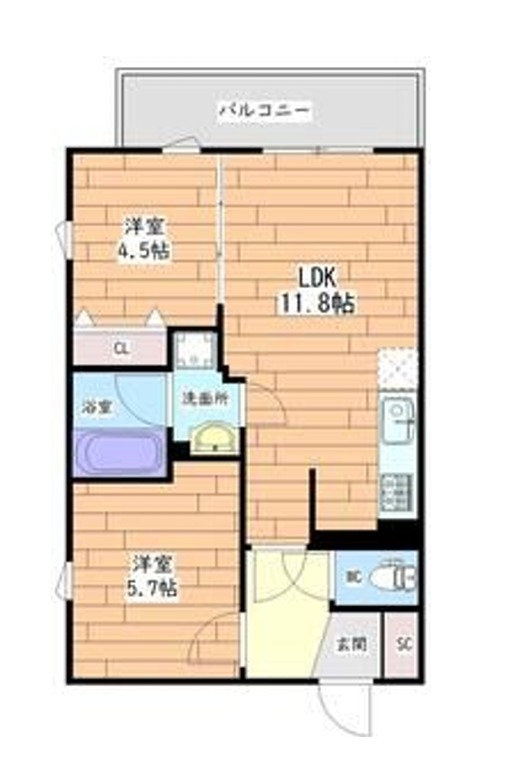 | 間取り詳細 | LDK 11.8畳 、 洋室 5.7畳 、 洋室 4.5畳 |