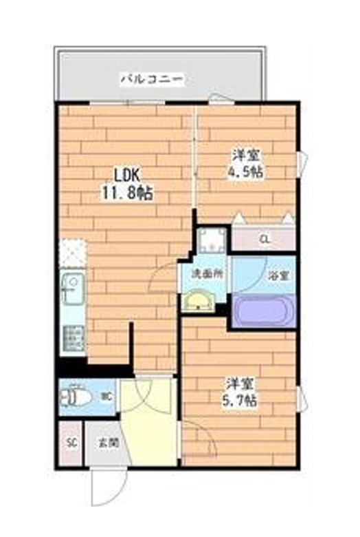 | 間取り詳細 | LDK 11.8畳 、 洋室 5.7畳 、 洋室 4.5畳 |