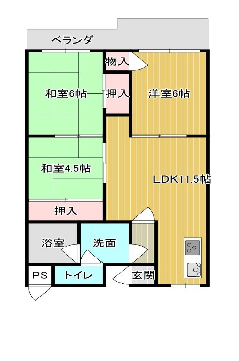 | 間取り詳細 | LDK 11.5畳 、 洋室 6畳 、 和室 6畳 、 和室 4.5畳 |
