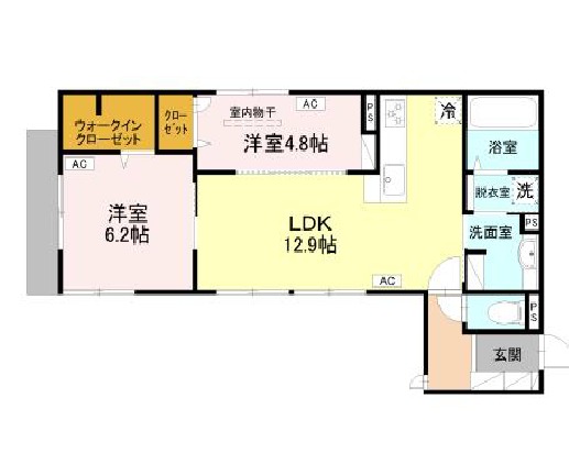 | 間取り詳細 | LDK 12.9畳 、 洋室 6.2畳 、 洋室 4.8畳 |