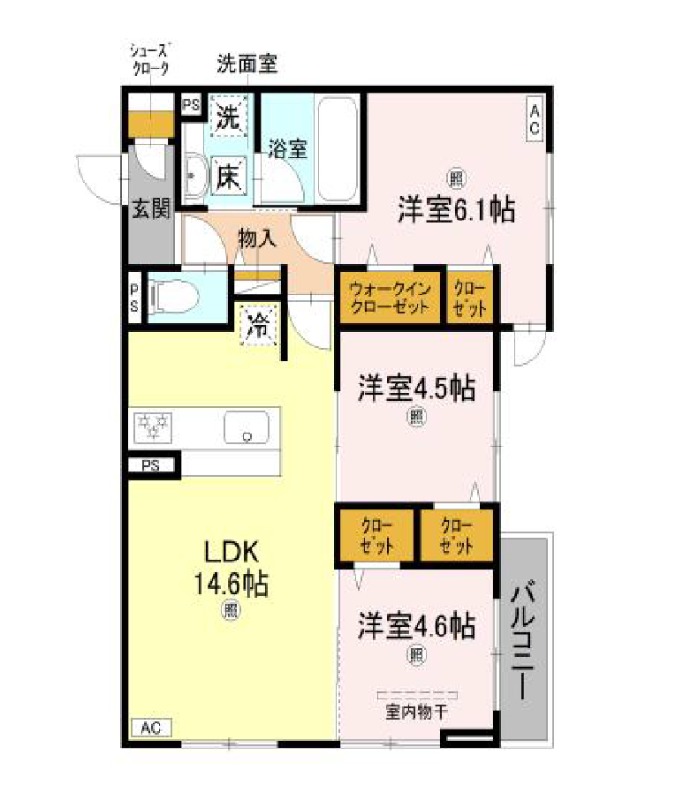 | 間取り詳細 | LDK 14.6畳 、 洋室 6.1畳 、 洋室 4.6畳 、 洋室 4.5畳 |