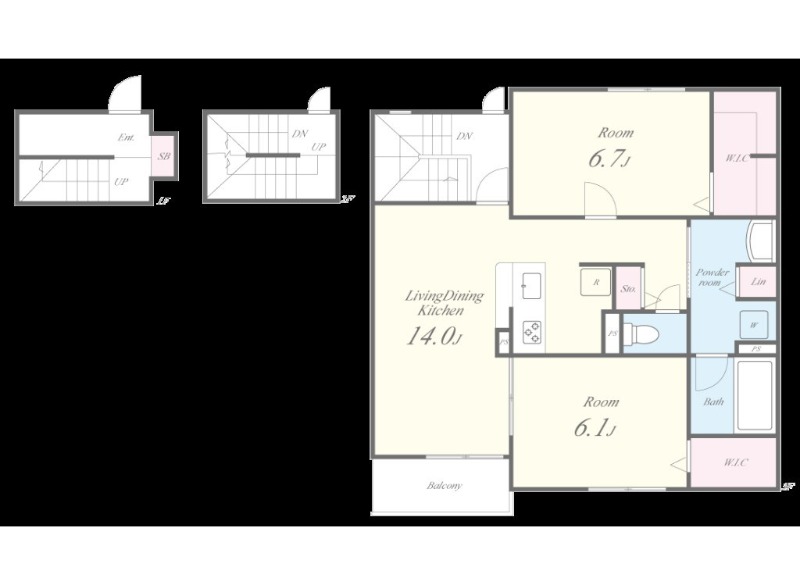 | 間取り詳細 | LDK 14畳 、 洋室 6.7畳 、 洋室 6.1畳 |