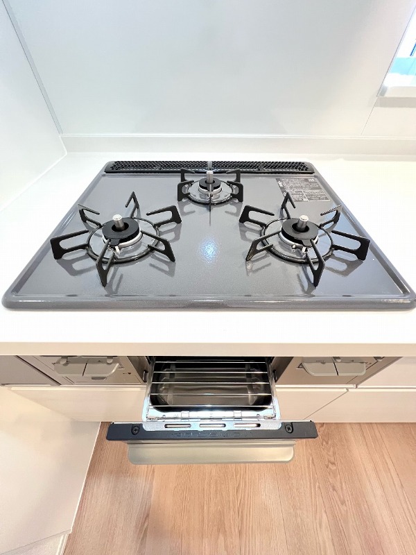 ガス(都市ガス)、インターホン(TVモニター付き)、防犯カメラ、オートロック、宅配ボックス、専用ゴミ置き場(あり)、駐輪場、日当り良好、通風良好、フローリング、全居室フローリング、クッションフロア、照明器具、ベランダ・バルコニー、ウォークインクローゼット、ウォークインクローゼット数(2)、下駄箱、シャワー、追い焚き、脱衣所、給湯、3点給湯、ウォシュレット、洗面台、洗面所独立、シャンプードレッサー、洗濯機置き場(室内)、コンロ設置済、コンロ口数(3)、コンロ種類(都市ガス)、グリル、システムキッチン、カウンターキッチン、エアコン、エアコン台数(1)、インターネット使用料無料 |
